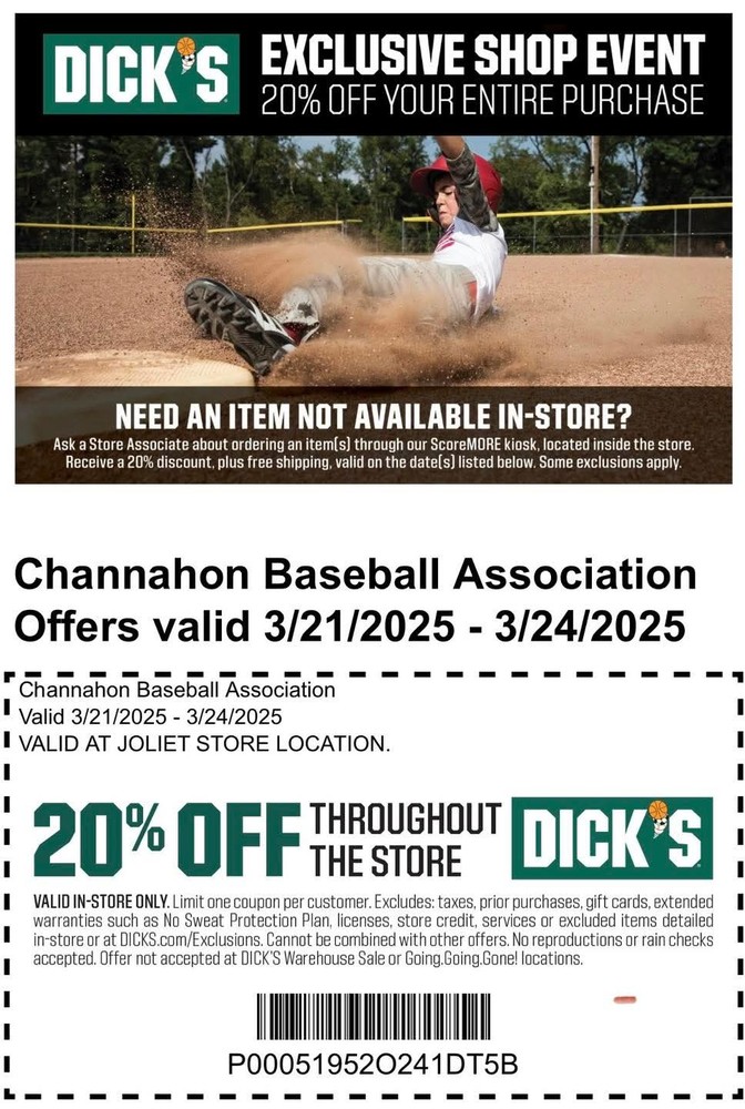 DICK'S Sporting Goods has provided Channahon Baseball with coupons for the weekend of 3/21/25 through 3/24/25. Usage is limited to one coupon per transaction. Happy Shopping!!