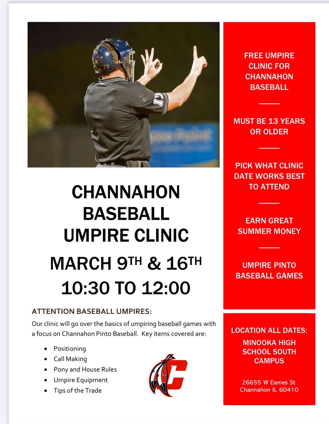 Is your teenager looking for some extra cash this summer. Come umpire at Channahon Baseball. We are growing rapidly which means more games, which means more opportunities for umpires! Come out and get the training you need to umpire games at Channahon Baseball.